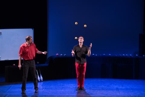 Comment une trajectoire de balles et les mathé-matiques peuvent-elles être liés ? Réunissant leurs deux univers, jongleur et mathématicien œuvrent ensemble dans un spectacle de jonglage musicale et scientifique.