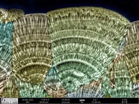 Sorbonne Université - Faculté des Sciences et Ingénierie Campus Pierre et Marie Curie 4 place Jussieu 75005 ParisThe female cephalopod Argonauta secretes a shell with its dorsal arms, being thus non-homologous to the molluscan shell1. It consists of two layers of fibers that grow and elongate perpendicular to the outer and inner surfaces2,3. Each fiber has a high-Mg calcitic core sheathed by extremely thin organic membranes3,4. These conform a polygonal (cellular) network in cross-section1. During growth, fibers with small cross-sectional areas tend to shrink, whereas those with large sections tend to widen. In this way, they follow the von Neumann-Mullins law5,6. Based on this behavior, we hypothesize that fibers evolve as an emulsion between the fluid precursors of both the calcite and organic phases. In addition, when polygons reach big cross-sectional areas, they become subdivided by new membranes. In this way, the size distribution of the organic polygons remains constant throughout growth. The only way to interpret this partitioning process is by inferring that the living cells from the mineralizing tissue are able to ‘locate’ particularly large polygons and subdivide them. To do this, living cells must perform contact recognition and subsequent secretion at sub-micron scale. Accordingly, the fabrication of the argonaut shell proceeds by physical self-organization together with direct cellular activity.