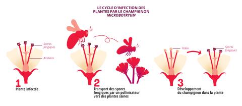 Depuis plus de vingt ans, Tatiana Giraud, directrice de recherche au laboratoire Écologie, société et évolution (ESE - Univ. Paris-Saclay/CNRS/AgroParisTech), se passionne aussi pour les champignons. « Ce sont des éléments importants à la fois écologiquement, agronomiquement et économiquement », justifie-t-elle. « Ce sont aussi des modèles passionnants pour les sciences de l’écologie et de l’évolution parce qu’ils ont des cycles de vie particuliers qui permettent de tester des hypothèses en laboratoire. » En plus de collaborer avec l’équipe de l’I2BC pour percer les secrets de P. anserina, la scientifique mène des recherches sur diverses maladies de plantes causées par des pathogènes. Parmi eux, se trouve Microbotryum, un genre de basidiomycètes qui s’attaque à la famille des Caryophyllacées comprenant des espèces telles que les œillets et les silènes. À la différence de nombreux pathogènes, Microbotryum ne tue pas son hôte. Il prolonge même sa vie pour lui faire produire ses propres spores. Pour y parvenir, le champignon fait avorter les ovules de la plante et fabrique ses spores à la place du pollen. « Il stérilise complètement la plante qui devient incapable de produire du pollen et des graines », précise la chercheuse. L’infection se manifeste par un changement d’aspect des anthères, la partie des fleurs contenant habituellement le pollen, qui se recouvrent d’une poudre noire constituée des spores fongiques. « L’avantage est que l’infection se voit facilement. C’est pour cela qu’on l’appelle la maladie du charbon des anthères. »