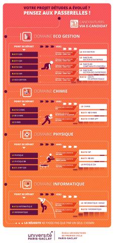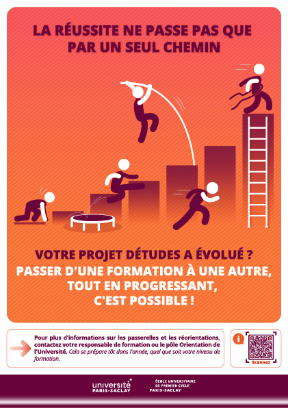 Vous pensiez vouloir faire des études technologiques en B.U.T mais vous optez finalement pour un parcours plus généraliste et une licence? Ou bien au contraire, vous étiez parti.e pour étudier jusqu’au doctorat mais finalement vous préférez professionnaliser votre parcours pour une insertion rapide avec une licence professionnelle ou un B.U.T ? Votre projet peut tout à fait évoluer avec le temps ! Et l’Université Paris-Saclay vous accompagne dans la construction de celui-ci.
