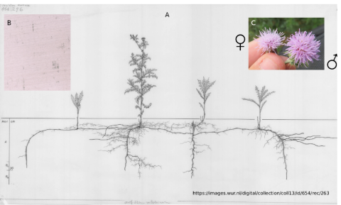 Figure: A. Le cirse des champs est une espèce pérenne produisant deux types de racines, verticales et horizontales. Celles-ci portent des bourgeons capable de régénérer des plantes entières.