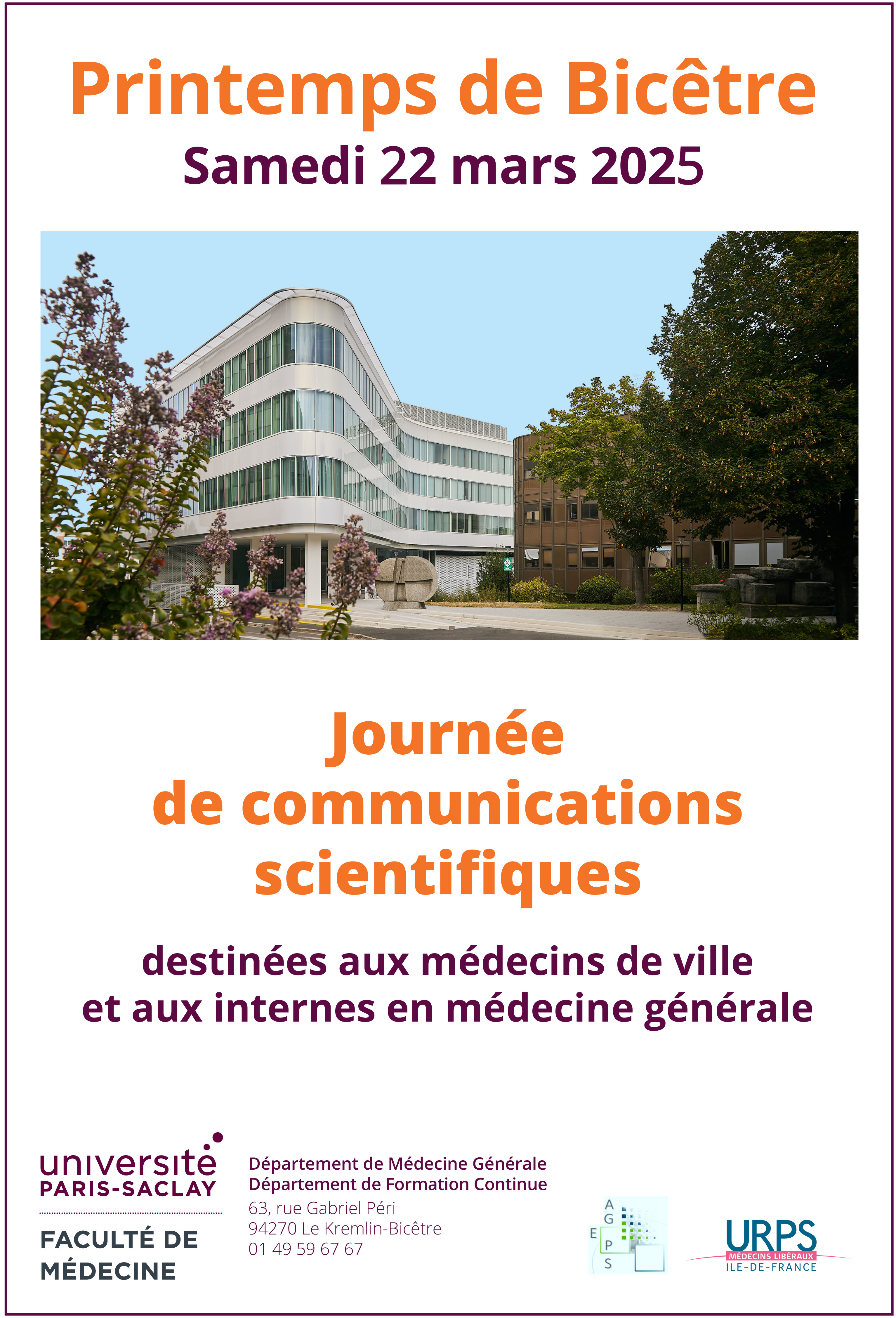 Faculté de Médecine Paris-SaclayLe Printemps de Bicêtre est une journée de formation continue à l'attention des médecins généralistes. Cette journée est organisée en trois sessions de présentations parallèles et d’un temps d’échange. Le contenu des communications orales, proposée au cours de cette rencontre du Printemps de Bicêtre, est conforme aux données les plus récentes et validées dans chacune des disciplines médicales.