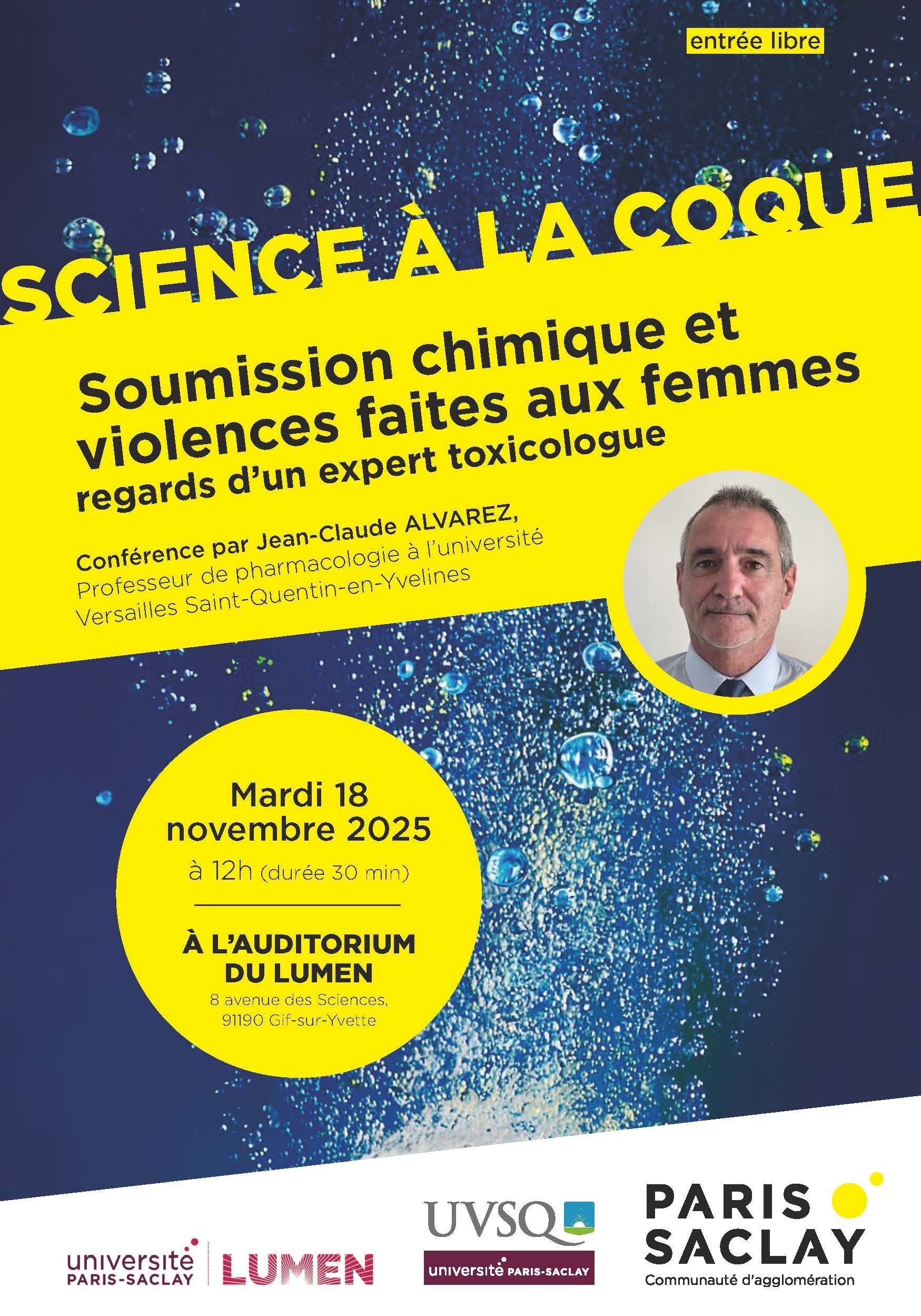 Auditorium, Bâtiment Lumen, 8 avenue des Sciences à Gif sur YvetteLa soumission chimique est définie pénalement par « l’administration volontaire de substance nuisible portant atteinte à l’intégrité physique ou psychique d’autrui », prévue et réprimée par le Code Pénal. Pour l’ANSM (Agence Nationale de Sécurité du Médicament et des produits de santé), la soumission chimique est « l’administration à des fins criminelles ou délictuelles de substances psychoactives à l’insu de la victime ». Ces faits relèvent de la médecine légale mais sont également rencontrés en milieu hospitalier, et peuvent toucher l’ensemble de la population, à tout âge. Cela peut concerner des enfants, chimiquement battus dans des situations où l’un des parents va vouloir abuser d’eux. Chez les sujets âgés, ce peut être par du personnel peu scrupuleux en maison de retraite ou EHPAD mais également par la famille pour une perte de jugement (et signature de chèques par exemple).