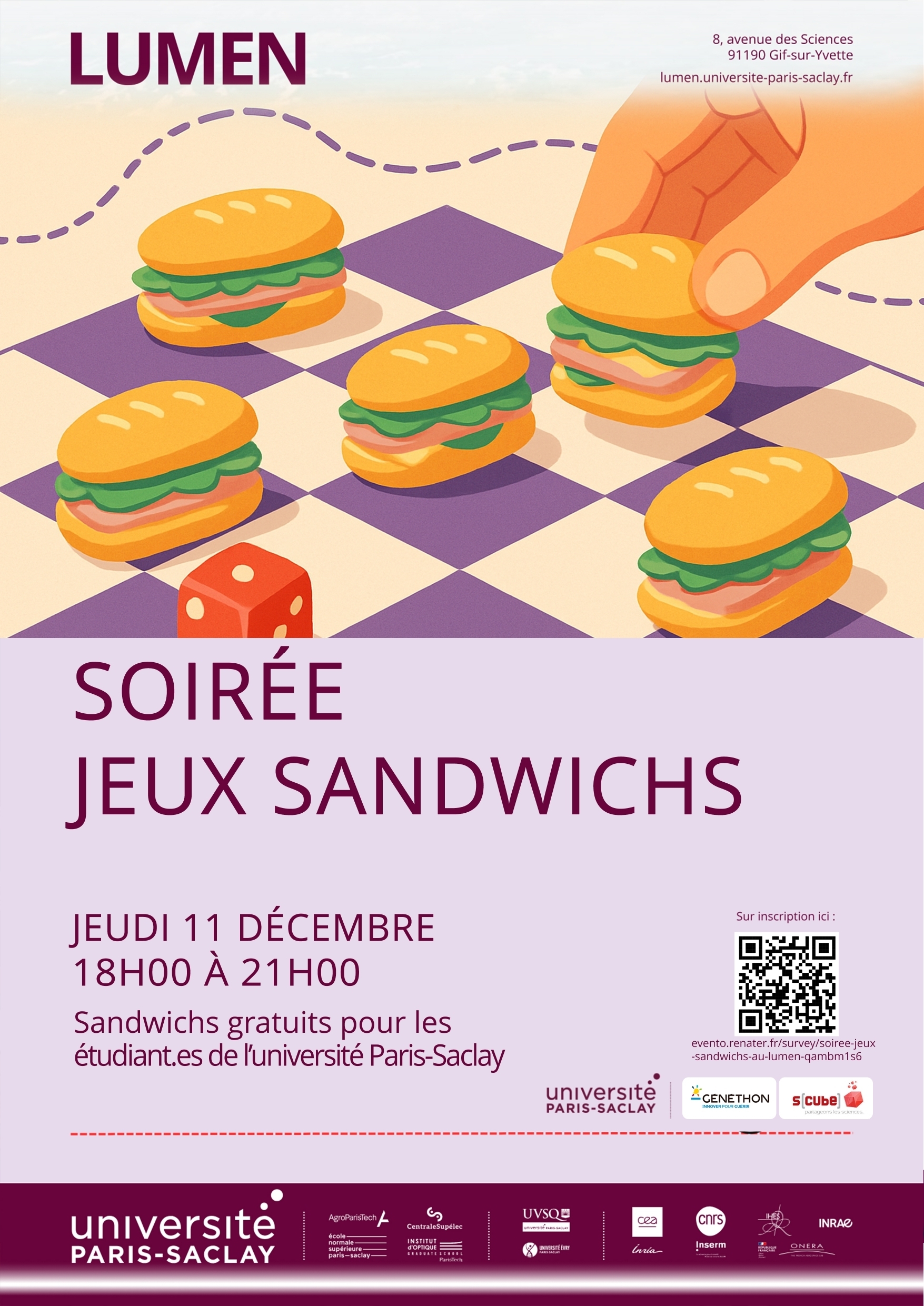 Dans le cadre de sa programmation et en collaboration avec GENETHON et l'association S[cube], le Lumen organise le jeudi 11 décembre de 18h00 à 21h00 une soirée jeux sandwichs.
