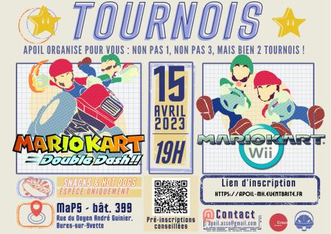 L'association APOIL vous propose de redécouvrir des jeux qui ont marqué votre enfance : Mariokart Wii !! et Double Dash !! Rendez-vous le samedi 15 avril à 19h à la MaPS (batiment 399) pour vous affronter sur la piste ! Une buvette sera à votre disposition avec hotdogs et snacks.
