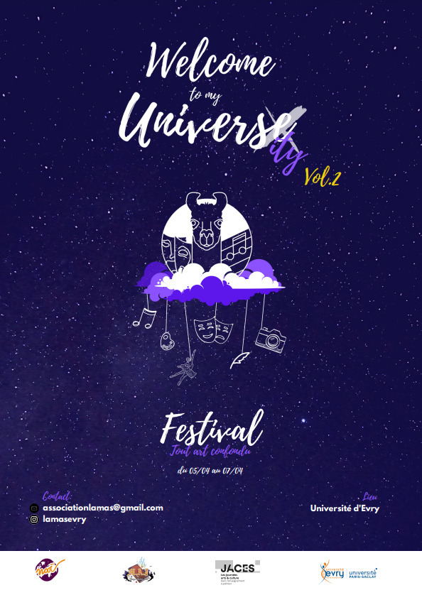 Welcome to my Universe est un festival tout arts confondus à l'initiative des étudiants et étudiantes et à destination de tous. Un art célébré durant trois jours : assistez à un concert ou profitez d'ateliers de danse ou encore de débats d'éloquence ! L'occasion de découvrir les talents artistiques qui sommeillent à l'Université d'Évry et dans notre ville.