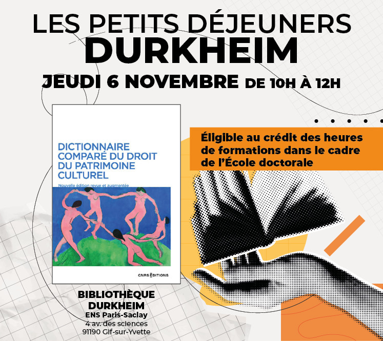 La MSH Paris-Saclay, le CEPS, l’IDHES et l’ISP de l’ENS Paris Saclay vous invitent à une nouvelle saison des Petits Déjeuners Durkheim. Cette reprise se fera le jeudi 6 novembre 2025 en compagnie de Marie Cornu, Vincent Négri autour de l’ouvrage Dictionnaire comparé du droit du patrimoine culturel, CNRS Éditions, 2025.