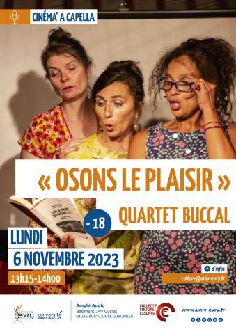Plus d'infos : https://www.univ-evry.fr/evenements/agenda-des-evenements-vie-etudiante/evenements-culture/osons-le-plaisir-compagnie-quartet-buccal.html?q=osons&backId=284&cHash=ac459cef79f76749c50732f5e5327c0a