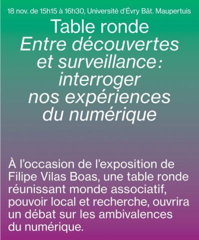 15h15 - 16h30 : Table ronde "Entre découvertes et surveillance - interroger nos expériences du numérique" (Université d'Évry)