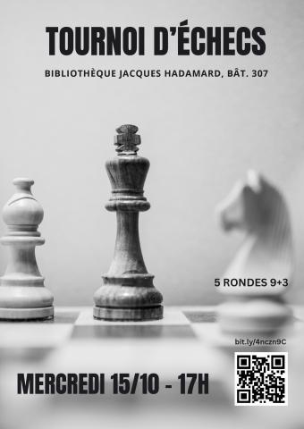IMO (Institut de Mathématique d'Orsay), bâtiment 307Le tournoi se déroulera en 5 rondes à la cadence 9 + 3 : 9 minutes initiales, avec 3 secondes supplémentaires après chaque coup.