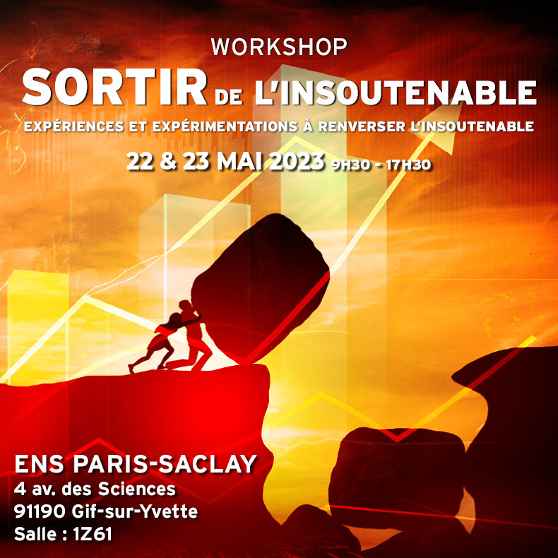 Le workshop « Sortir de l’insoutenable » aura lieu à l’ENS Paris-Saclay les 22 et 23 mai 2023 de 9h30 à 17h30 (salle 1Z61).