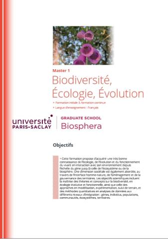 La première année de M1 intitulée M1 Ecologie permet aux étudiants d’acquérir tous les fondamentaux en écologie évolutive, écologie fonctionnelle, modélisation mais également écologie de terrain (initiation au diagnostic écologique et à la construction de plans de gestion). Les étudiants doivent également suivre une UE de sensibilisation aux grandes questions environnementales portée par la GS Biosphera (Grands Defis pour l'environnement, cycle de conférences) portant sur des thématiques transversales de la gestion de l'environnement, la biodiversité, l'économie et le droit de l'environnement, l'agriculture, la nutrition, etc. Le second semestre permet aux étudiants d’approfondir leurs compétences dans différents domaines de l’écologie (écologie fonctionnelle, écologie de la conservation, dynamique de populations/ évolution, ingénierie écologique) ou différents types d’écosystèmes (écologie des milieux marins, écologie des sols …) grâce notamment à de nombreuses UE associant théorie et étude sur le terrain. La seconde année de la mention BEE se divise en 6 parcours spécialisés dans les différents domaines de la gestion et de la compréhension de la biodiversité à toutes ses échelles, du gène à la biosphère (EVEF, ECIRE, AEP, EVOGem), mais également de la gestion des pollutions (PCGE). Les parcours EVEF et EVOGem forment plus particulièrement aux métiers de la recherche, alors que les parcours ECIRE, AEP et PCGE forment à la fois aux métiers de la recherche et aux métiers de l’expertise. Un des parcours prépare plus spécifiquement au concours de recrutement de l'éducation nationale de l’agrégation en Sciences de la vie, sciences de la Terre et de l'Univers.