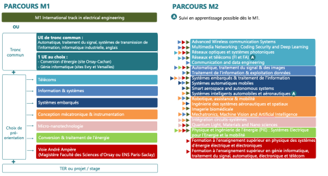 Les sept parcours de M1 préparent les étudiants avec un socle commun. Vers la fin du premier semestre, une coloration, via des options, permet de préparer les étudiants aux différents parcours de M2. Cette coloration est accentuée au second semestre de M1. Les petits triangles devant chaque parcours ont les couleurs des 7 grand parcours.