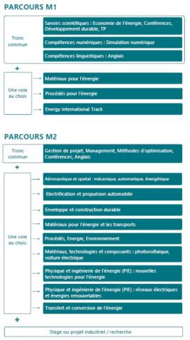 L'offre de formation embrasse, de façon globale et transverse, le domaine de l'énergie (physique des nombreuses sources, production, conversion, stockage, gestion) et son intrication complexe avec le transport au sens large. L'énergie produite doit, en effet, pouvoir être efficacement transportée et utilisée. Les transports de biens et de personnes nécessitent, eux-mêmes, de l'énergie et imposent donc d'améliorer tout à la fois les modes de propulsion (propulsion électrique, hybride, combustion), la conversion et le stockage de l'énergie, les structures (allègement, résistance, procédés d'assemblage).Les thèmes abordés au sein du Master énergie (matériaux innovants, nouvelles technologies de l'énergie, réseaux, mobilité durable) sont largement représentés dans les activités de recherche des établissements partenaires et des centres de R&D du territoire. En effet, cette formation s'appuie sur un tissu exceptionnel, dans le domaine de l'énergie, au niveau du Plateau de Saclay : 2 Instituts de la Transition Energétique (IPVF sur le photovoltaïque, VEDECOM sur la mobilité décarbonnée) et de nombreux laboratoires de recherche académiques (CNRS, CEA...) et industriels (Renault, PSA, Thales, Safran, EDF...).
