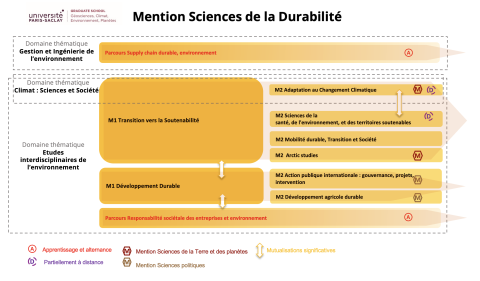 Organisée autours d'un tronc commun s'étendant sur 4 semestre, la mention Science de la Durabilité de l'Université Paris Saclay est constituée de 10 éléments de formation. Il s'agit de 2 parcours types intégrés M1+M2 (Responsabilité Sociétale des Entreprises et Environnement, Supply Chain Durable), 2 M1 (Transition vers la Durabilité et Développement Durable) conduisant à 5 M2 pour le premier (Adaptation au Changement Climatique; Science de la Santé, de l’Environnement et des Territoires Soutenables; Arctic Studies, Mobilité Durable Transition et Société) et 2 M2 pour le second (Développement Agricole Durable et Action Publique Internationale : Gouvernance, Projets, Intervention). Ces éléments contribuent à trois domaines thématiques de la Graduate School Géosciences, climat, environnement, planète.
